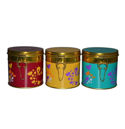 經(jīng)典帶鎖扣圓形通用鐵罐 翻蓋馬口鐵盒定制