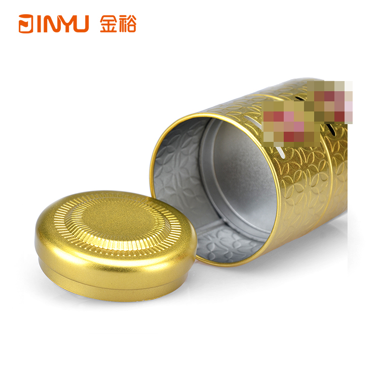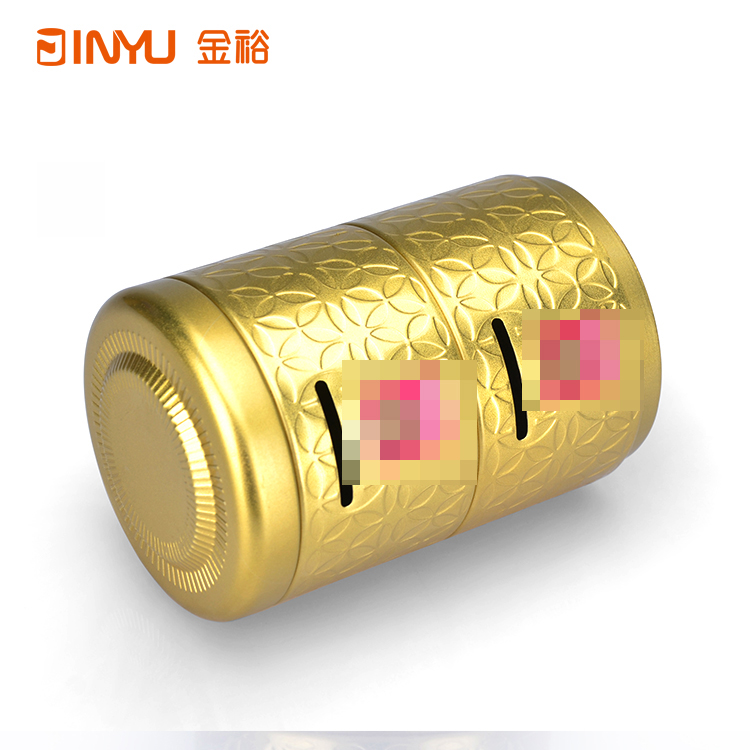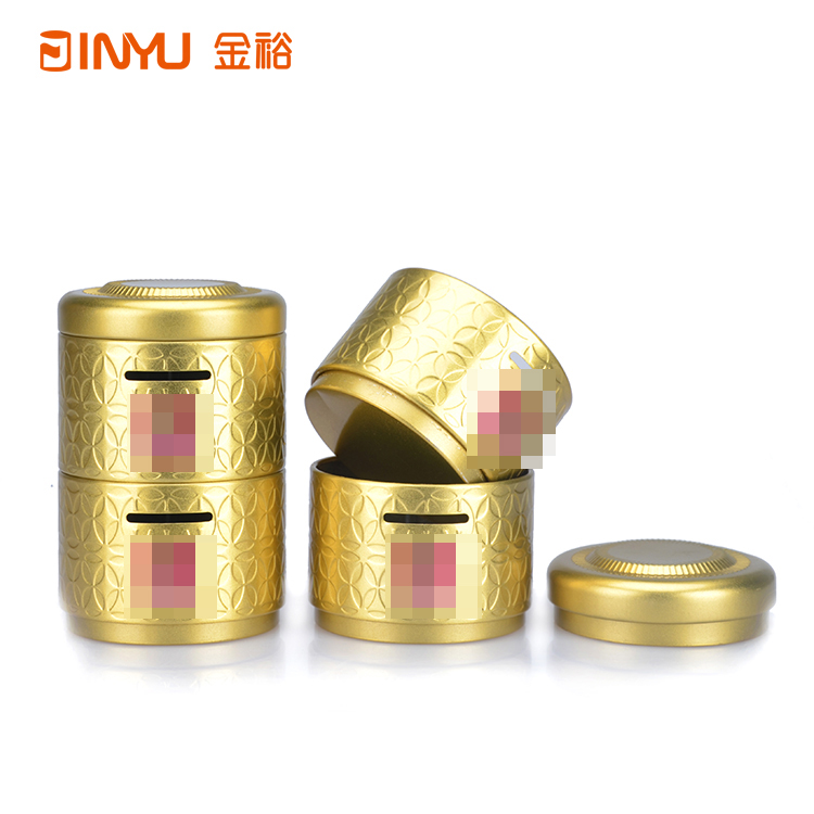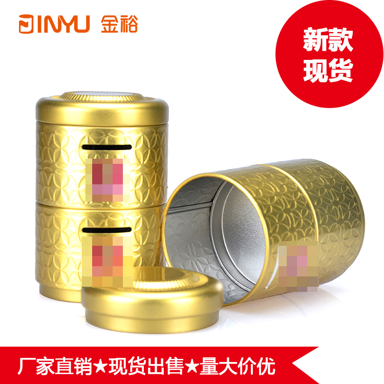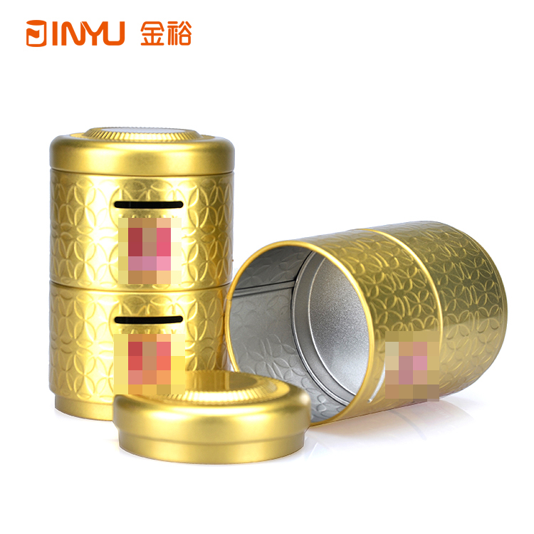 鐵罐表面做激凸花紋雕刻處理,鐵罐身體部位做開口處理,用于硬幣等紀(jì)念品的投入。