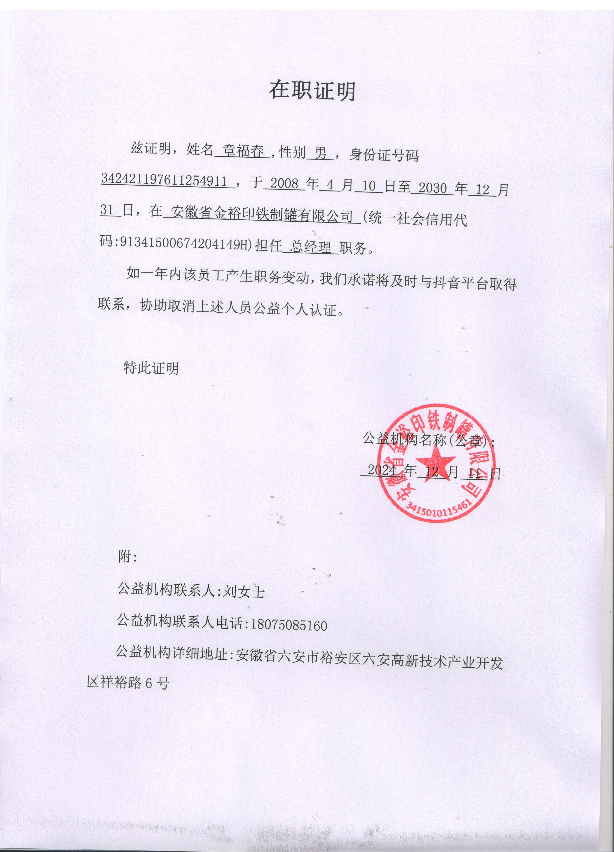 茲證明,姓名章福春 ,性別男,身份證號碼342421197611254911 ,于2008年4月10日至2024年12月11 日,在安徽省金裕印鐵制罐有限公司 (統(tǒng)一社會信用代碼:91341500674204149H)擔(dān)任總經(jīng)理職務(wù)。