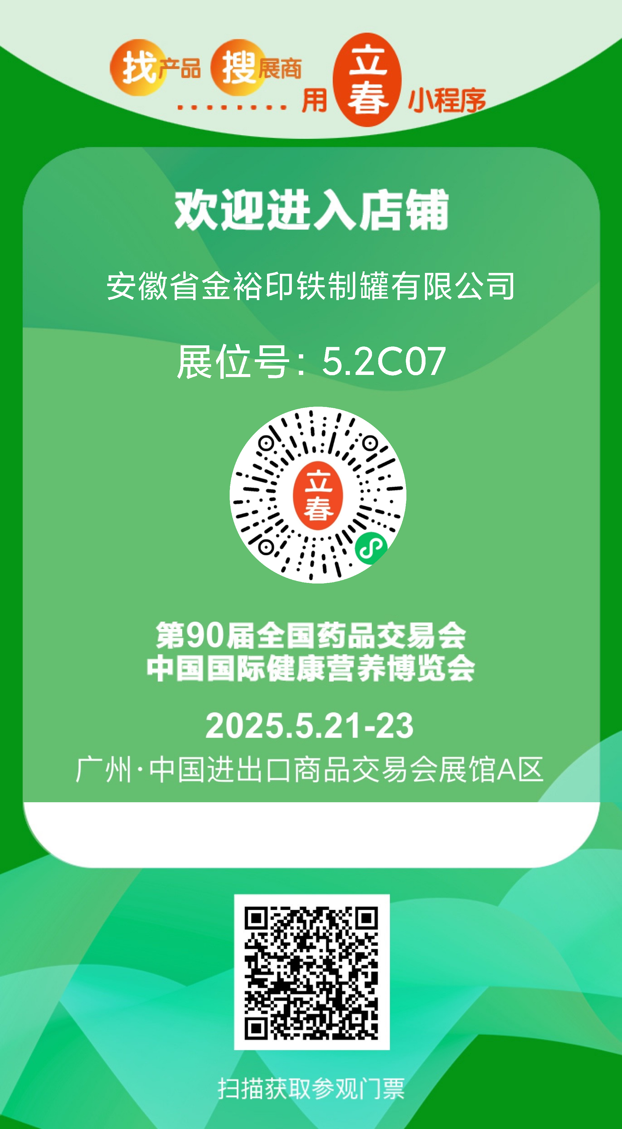 本次展會將于 2025 年 5 月 21 日 - 23 日在廣州中國進(jìn)出口商品交易會展館 A 區(qū)舉辦,我們的展位號是 5.2C07。在這里,您不僅能與我們面對面交流,還能近距離感受金裕制罐匠心打造的藥品鐵盒包裝產(chǎn)品,期待與您共話合作機(jī)遇!現(xiàn)在掃碼即可免費領(lǐng)取參觀門票,輕松開啟這場醫(yī)藥行業(yè)的精彩之旅!