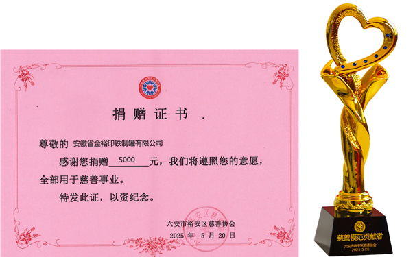 作為從裕安這片熱土上成長起來的本土企業(yè),金裕制罐深知企業(yè)的發(fā)展離不開家鄉(xiāng)人民的支持與社會各界的關愛?!案卸魃鐣?,回饋桑梓”早已融入我們的血脈,成為企業(yè)堅定不移的核心價值理念。多年來,我們始終將慈善公益視為己任,用點滴行動傳遞溫暖: